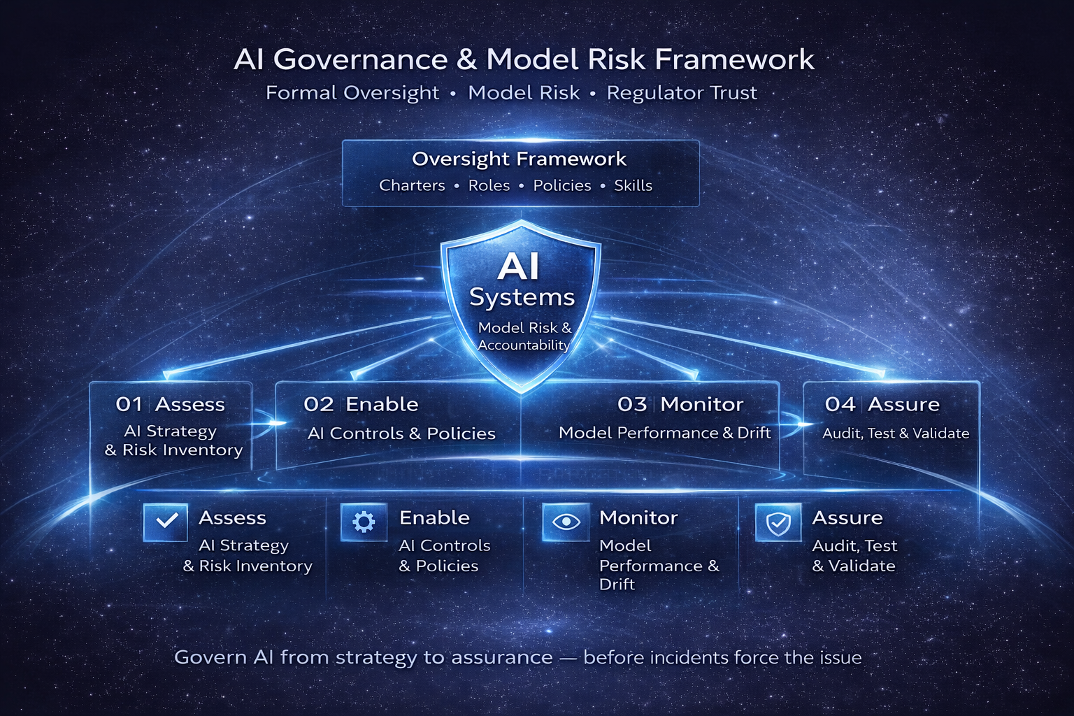 A board-ready governance framework enabling executives to oversee AI strategy, model risk, and regulatory accountability—from design through assurance—without slowing innovation.
