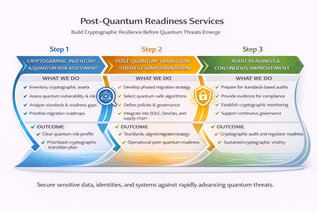 Our Quantum Risk & Post-Quantum Readiness Services help organizations assess quantum exposure, design transition strategies, implement cryptographic governance, and achieve operational and audit readiness aligned with emerging standards and enterprise risk tolerance.