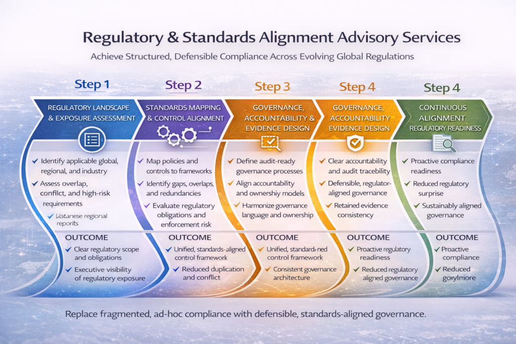 Our Regulatory & Standards Alignment Advisory Services help organizations proactively align governance, controls, and evidence across global standards—so compliance becomes structured, defensible, and scalable instead of reactive and fragmented.